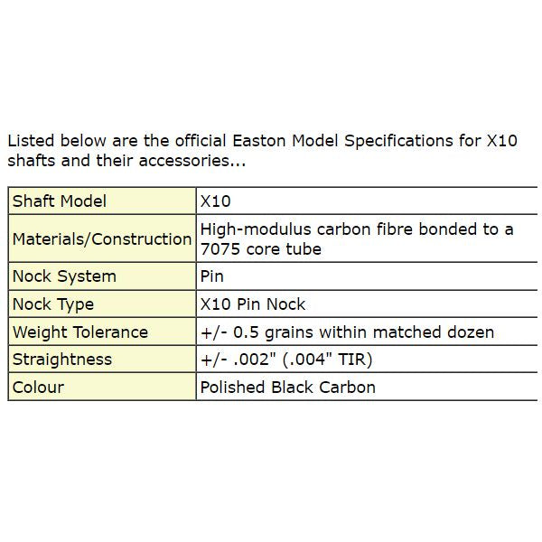 Easton X10 shafts should be sold only in matched dozens - as supplied by Easton. Beware of any dealer selling part sets or individual shafts.