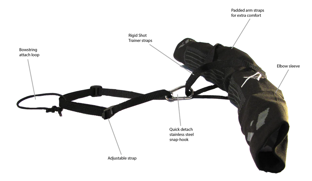 The Shot Trainer is a technique training device that teaches you how to release the bowstring while maintaining shot strength and direction. The sleeve slides over your shooting arm while the adjustment strap is looped and attached to the bowstring. Once attached, releasing the bowstring transfers the force of the bow to your drawing arm elbow, forcing you to maintain strength and direction without interruption.