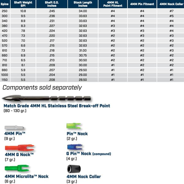 X10 4mm Parallel Pro is made with durable A/C construction meeting multi-use competition field compliance standards, worldwide. The weight-coded, shafts seamlessly pair with Easton's top-tier 4mm points, nocks, pins, halfouts and collar systems and are offered in 15 precise spine values from 250 down to 1150.