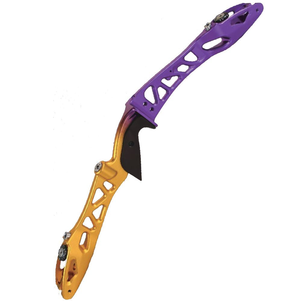 New model for 2026. Constructed from full CNC aluminium. Weighing just 1170g this riser is available in a vast array of colour options including seven single colour anodized colours and eight spectacular two-tone anodized colours such as the purple/gold riser pictured here. All options are available in both RH and LH types in standard 25in riser length. International limb fitting. Made in South Korea.